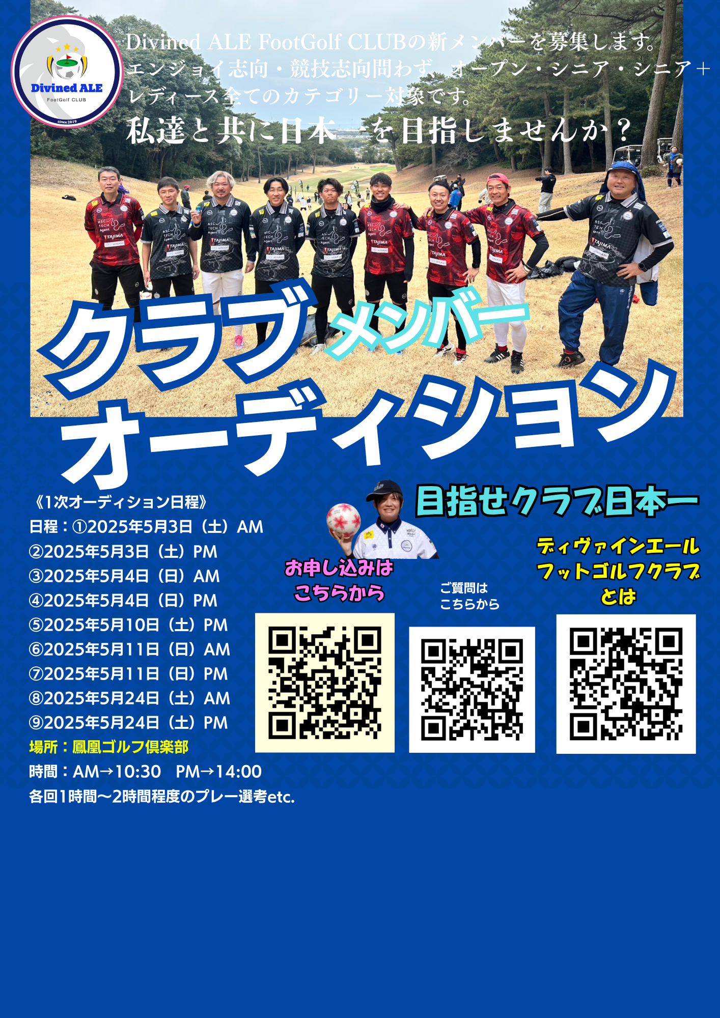 この度、Divined ALE FootGolf CLUBのメンバーを募集いたします。エンジョイ志向・競技志向問わず、オープン・シニア・シニア+・レディース全てのカテゴリー対象です。